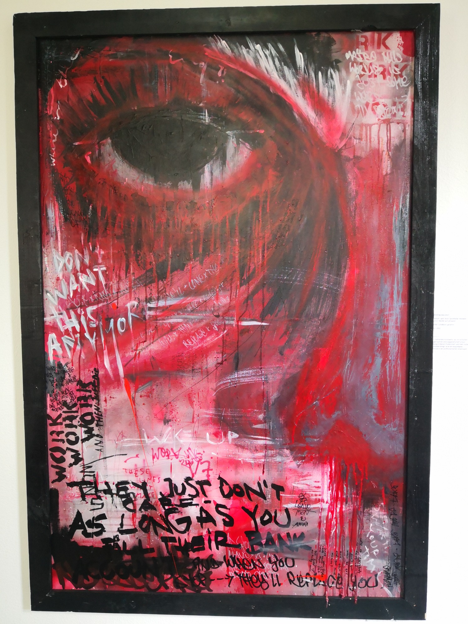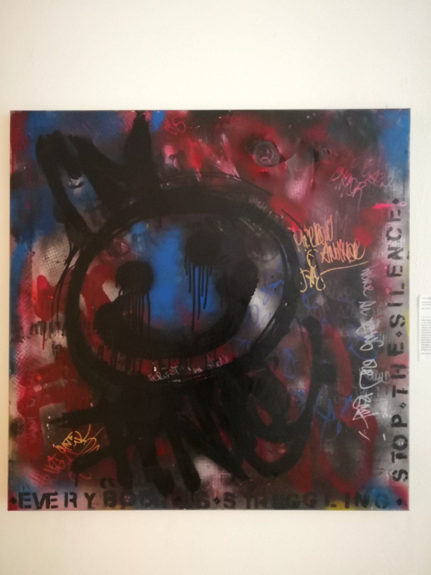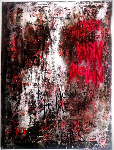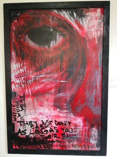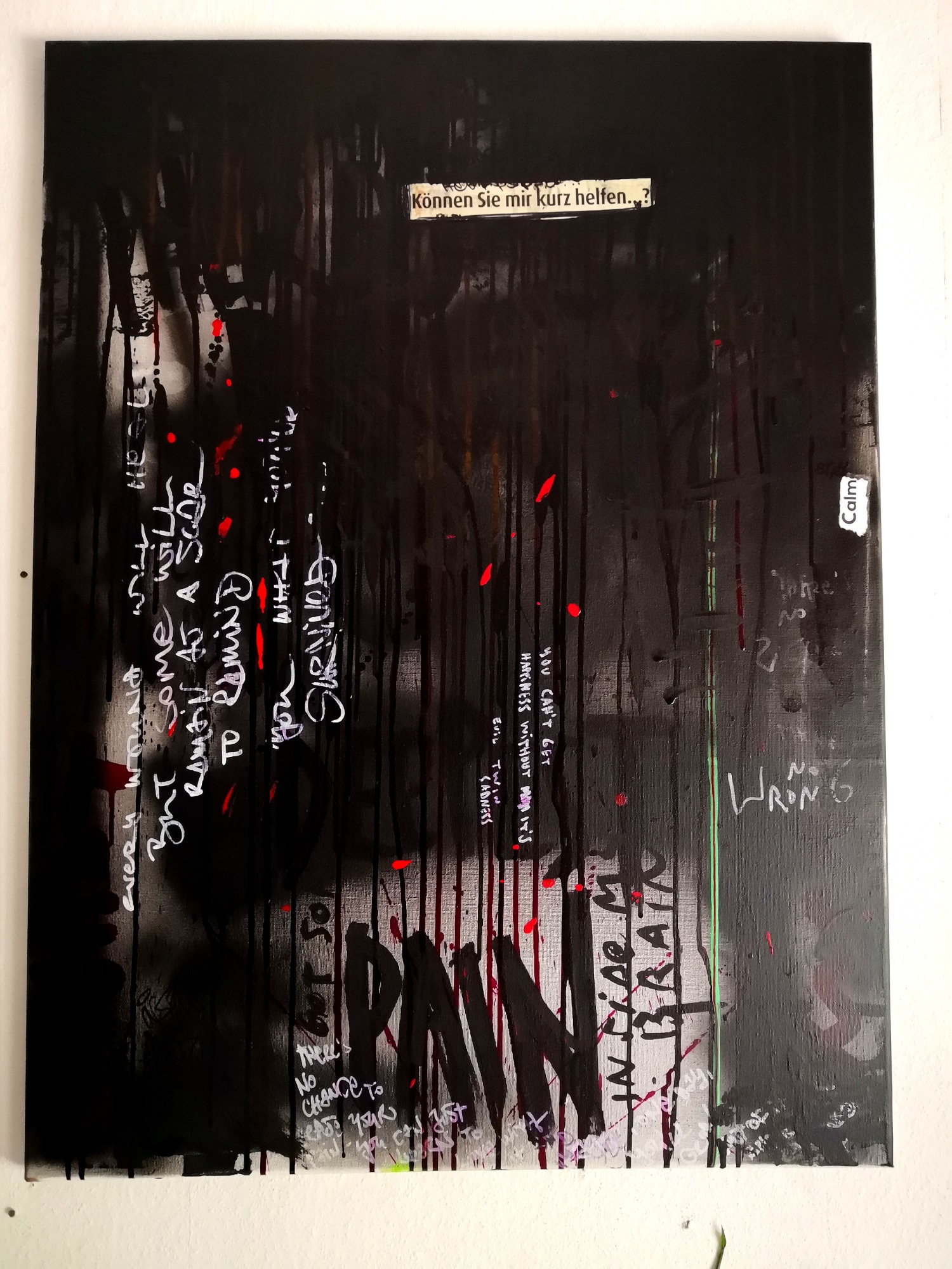 Eine roh-direkte Zustandsdiagnose. Die Arbeit verdichtet Frustration und Systemkritik zu einer visuellen Wutrede.