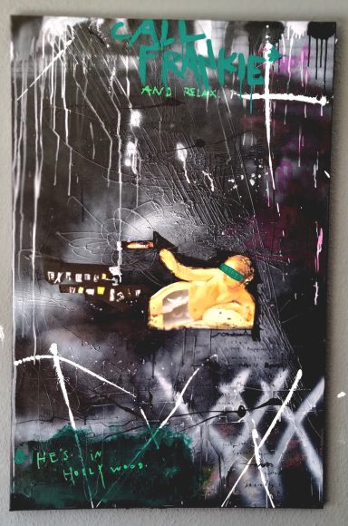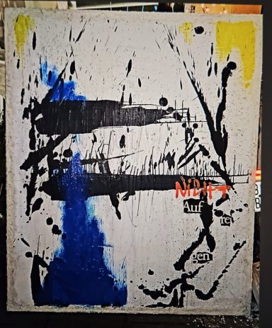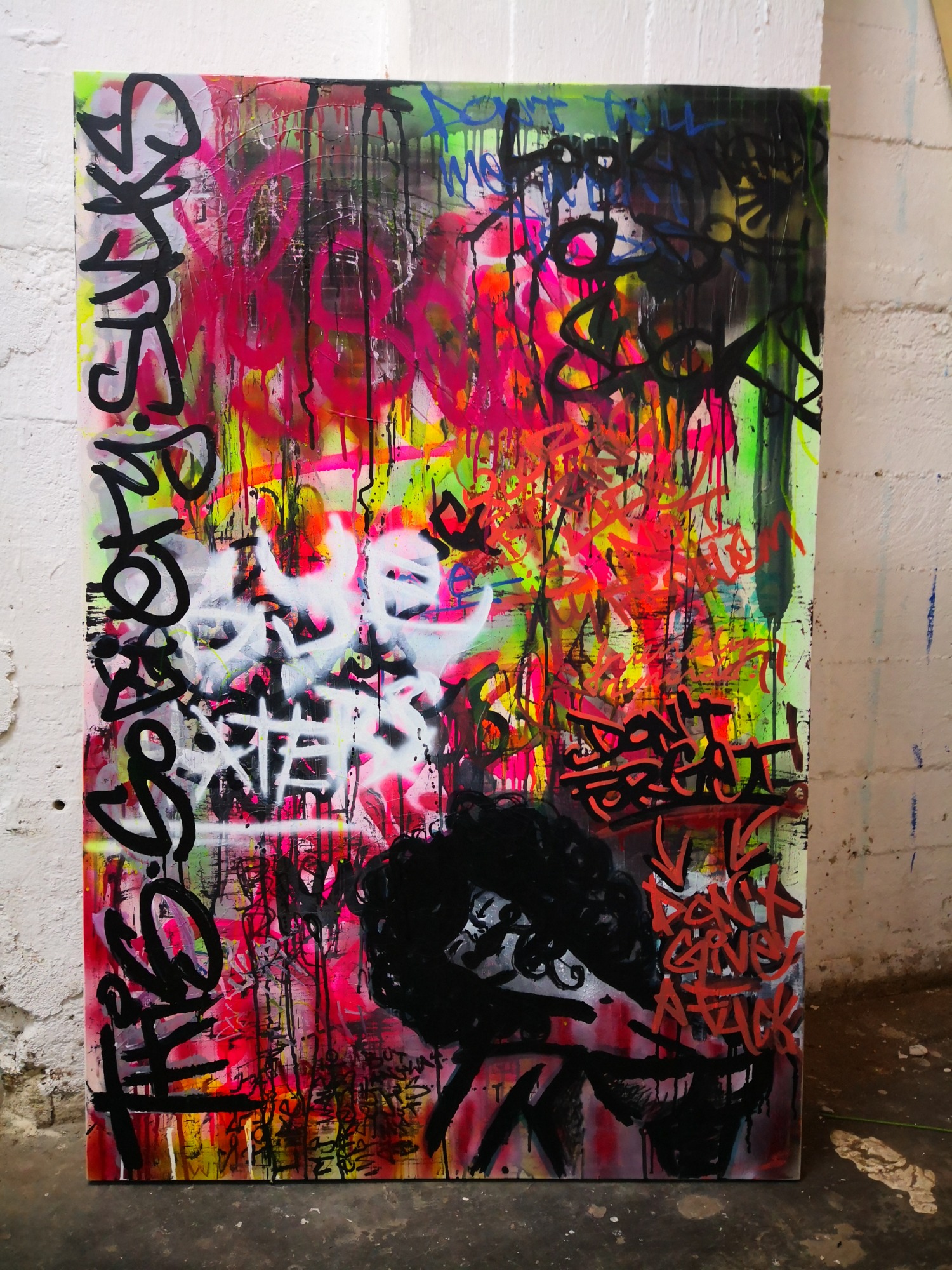 Die collagierten Wortfragmente „NICHT“ und „aufregen“ wirken wie ein ironischer Reminder im Chaos – roh, laut und urban.