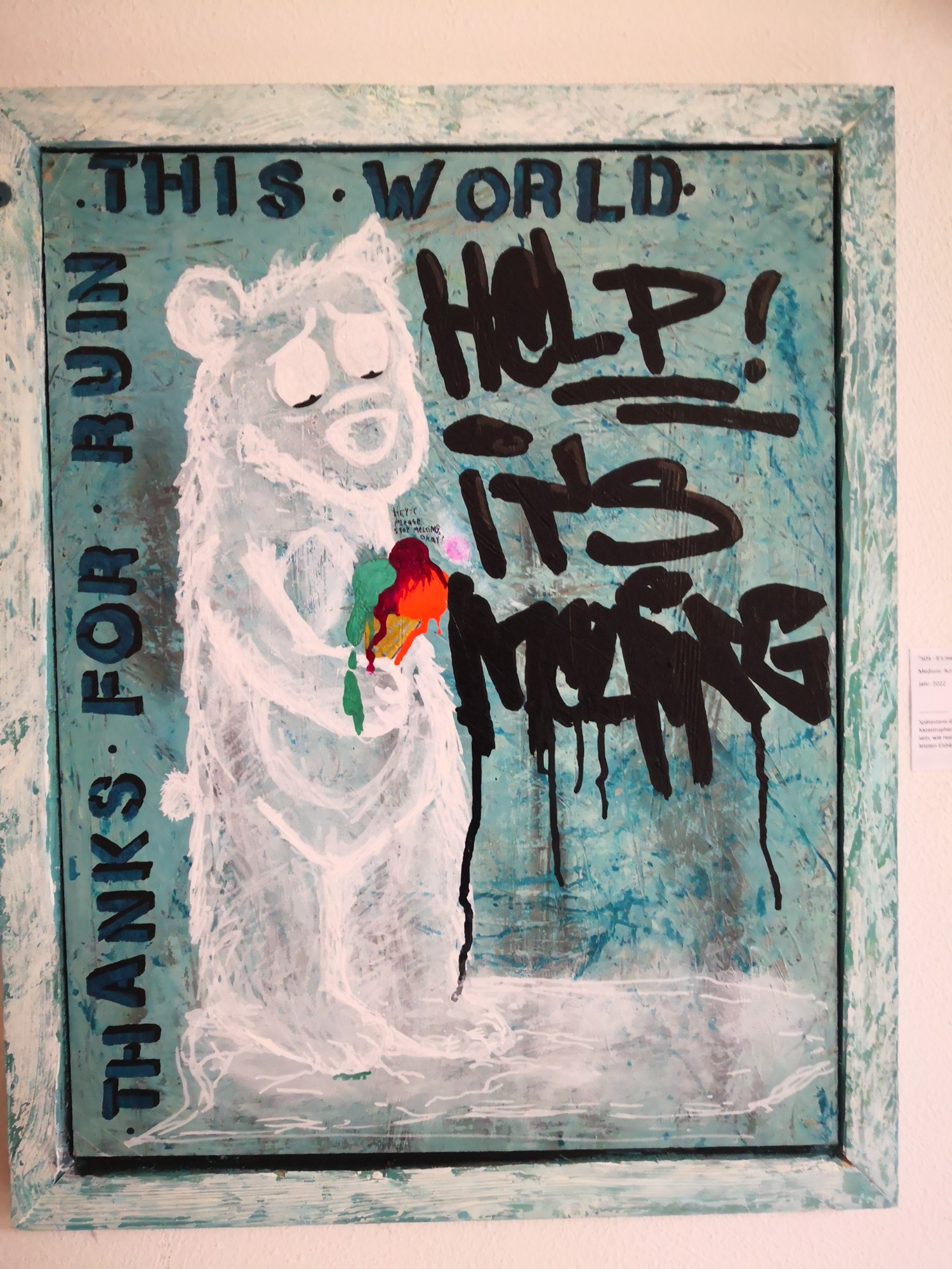 Klimapanik als persönlicher Zustand. Der Schriftzug wirkt wie ein Hilferuf auf schmelzendem Untergrund - zart und aggressiv zugleich.